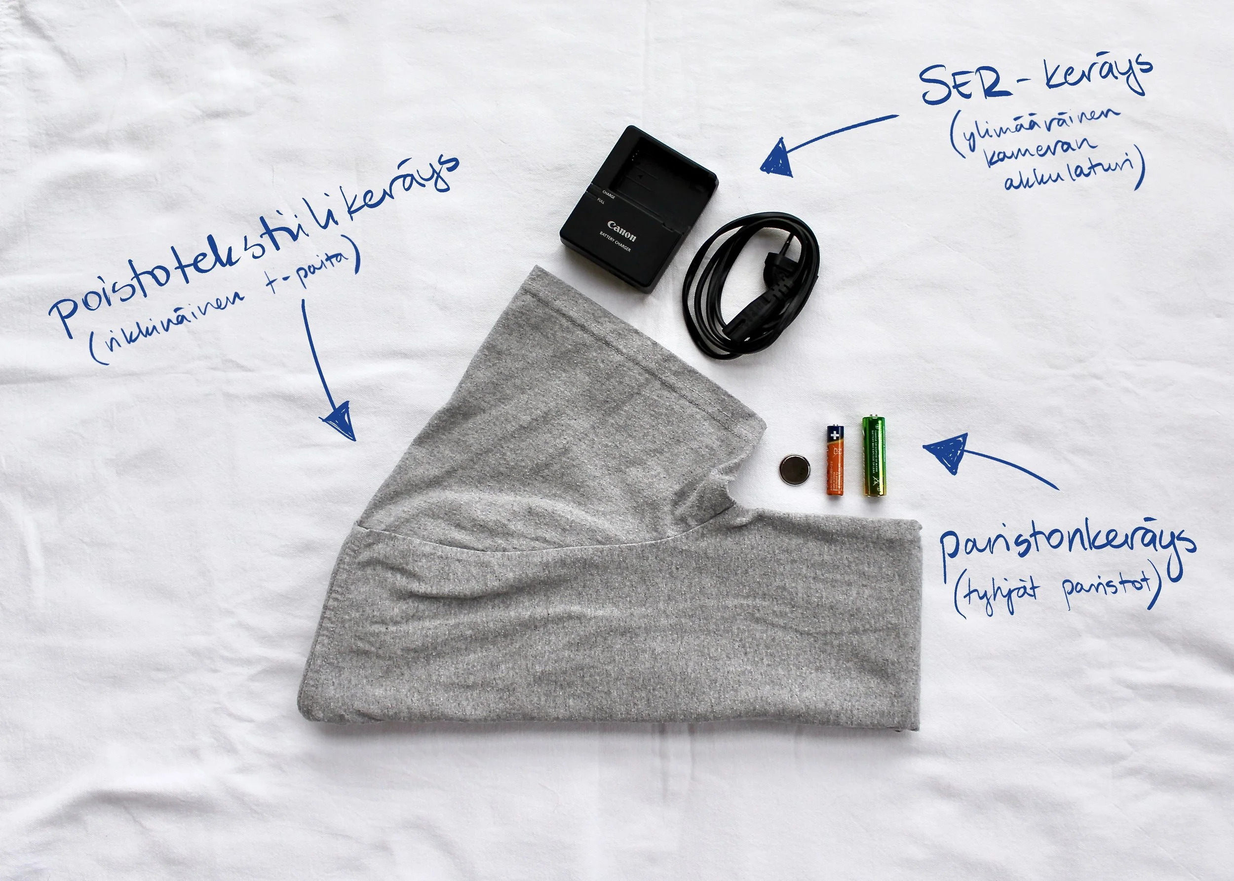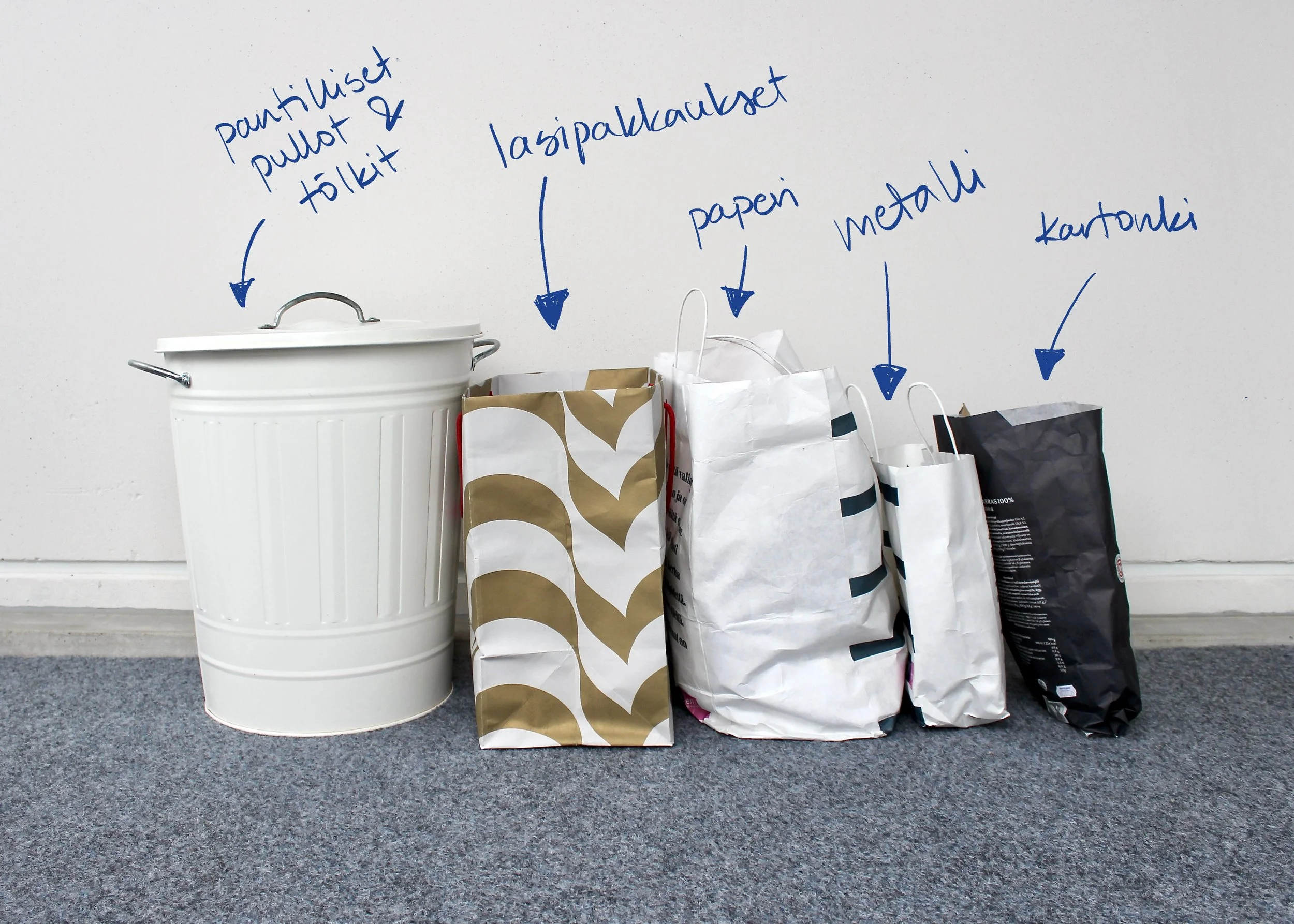 Ennen kuin ryhtyy järjestämään kotiaan ja karsimaan tavaraa, kannattaa aloittaa perustamalla kotiinsa ”kierrätysnurkkauksen”. Sinne voi valmiiksi sijoittaa paperikasseja tai koreja eri kategorioille. Alueen ei tarvitse olla suuri: se voi olla esimerkiksi siivouskaappi tai vaikkapa päältä avattava penkki.